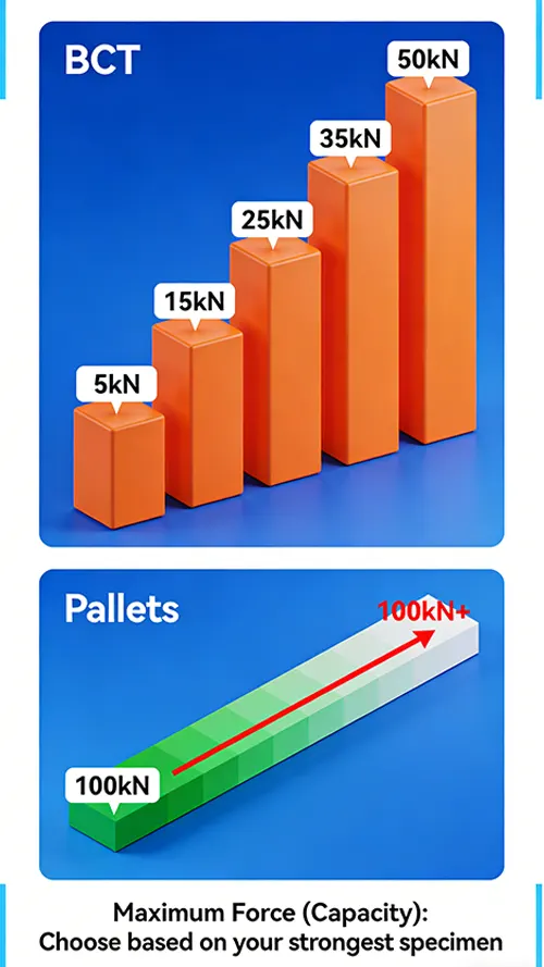 Maximum Force (Capacity): Choose based on your strongest specimen. For BCT, common ranges are 5kN (~500kgf) to 50kN (~5000kgf). For pallets, 100kN+ may be needed.