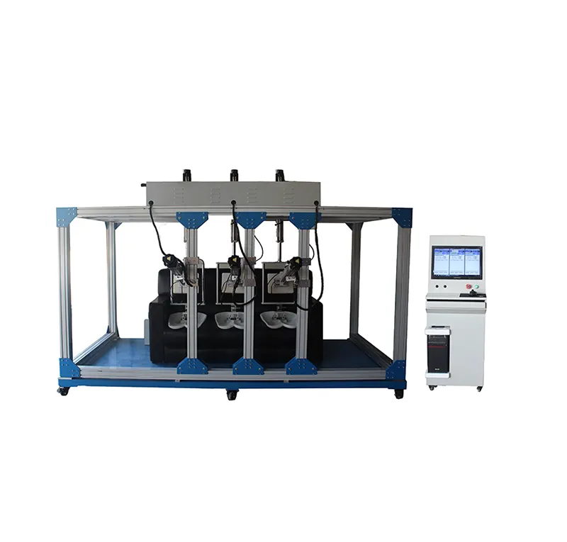 The three-seater sofa durability testing machine is a specialized testing device that simulates real usage scenarios, used to evaluate the structural stability, material durability and functional integrity of three-seater sofas during long-term use. The core objective is to accelerate the simulation of the load, friction, compression and other stresses that the sofa may withstand during daily use through standardized and repeatable mechanical actions, thereby predicting its service life, potential failure modes, and providing data support for product design optimization.